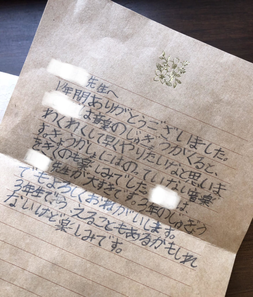 写真は年度末に子どもたちからもらったプレゼントとお手紙。本当に幸せな仕事だなぁとしみじみ。